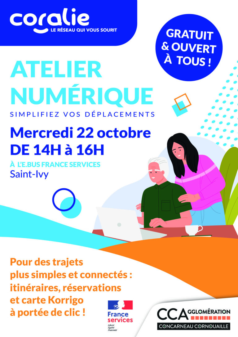Le réseau Coralie vient à la rencontre des habitants de Saint-Yvi. L’équipe Coralie sera présente à bord de l’E-Bus France Services de Concarneau Cornouaille Agglomération pour un temps d’échange dédié à la mobilité. Cet événement est l’occasion de découvrir les services et nouveautés du réseau, et de bénéficier d’un accompagnement gratuit, personnalisé sur vos démarches de transport et de mobilité.